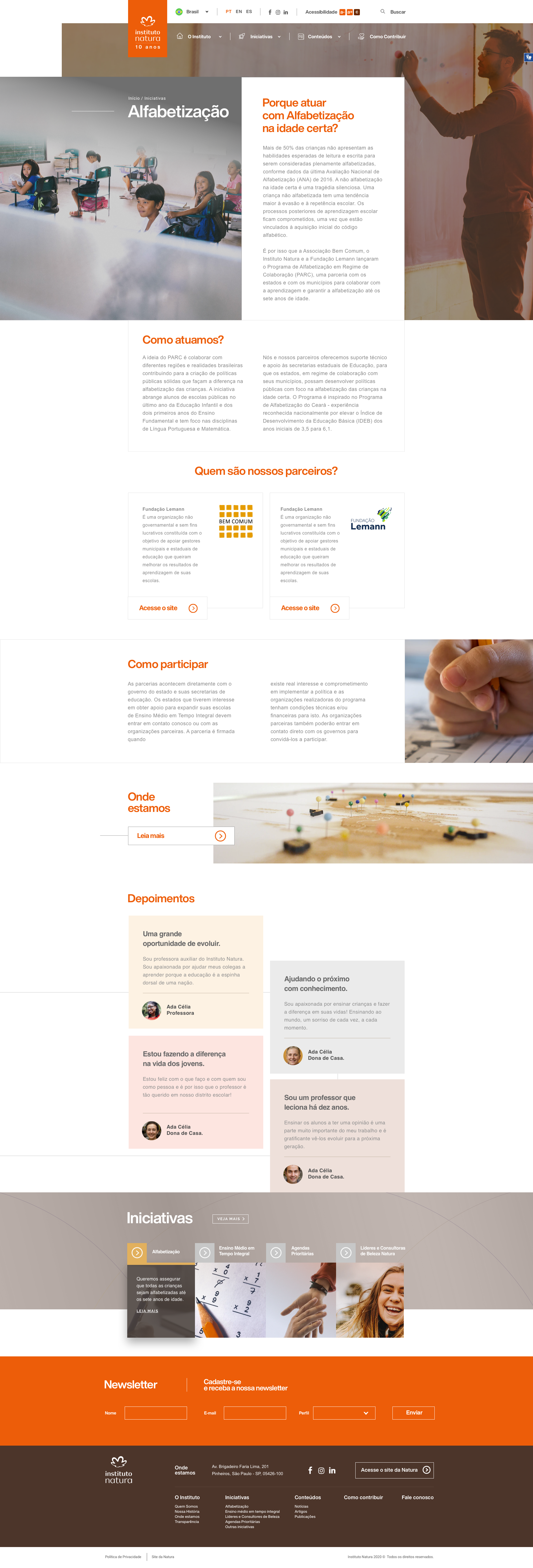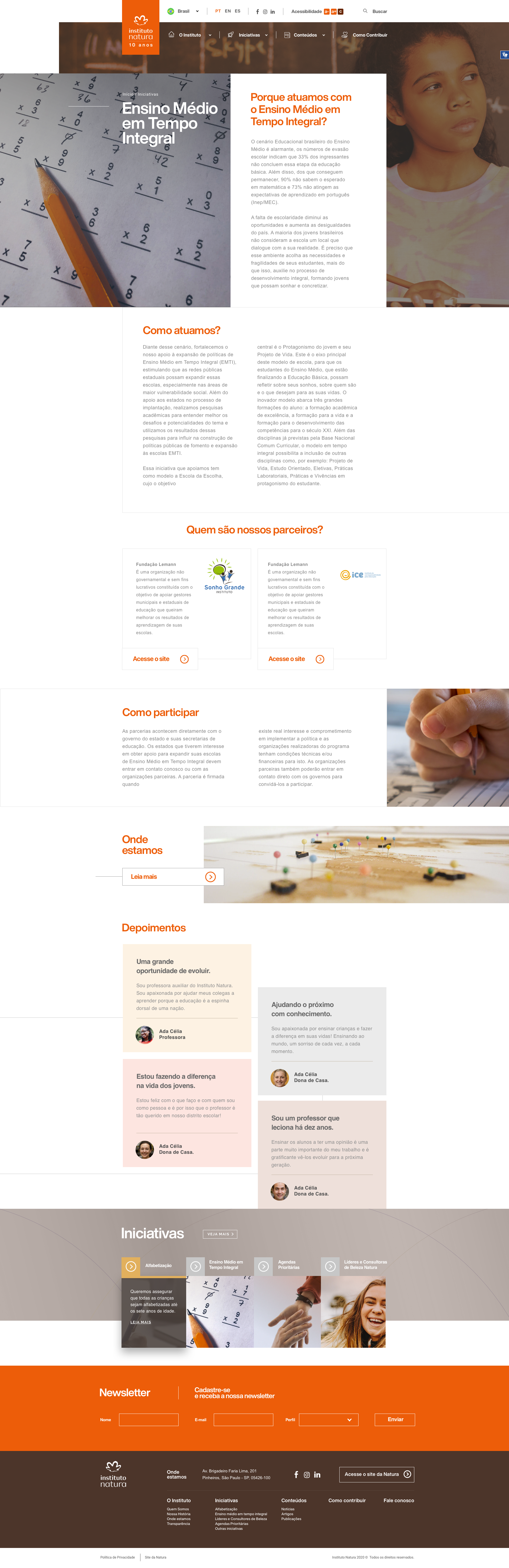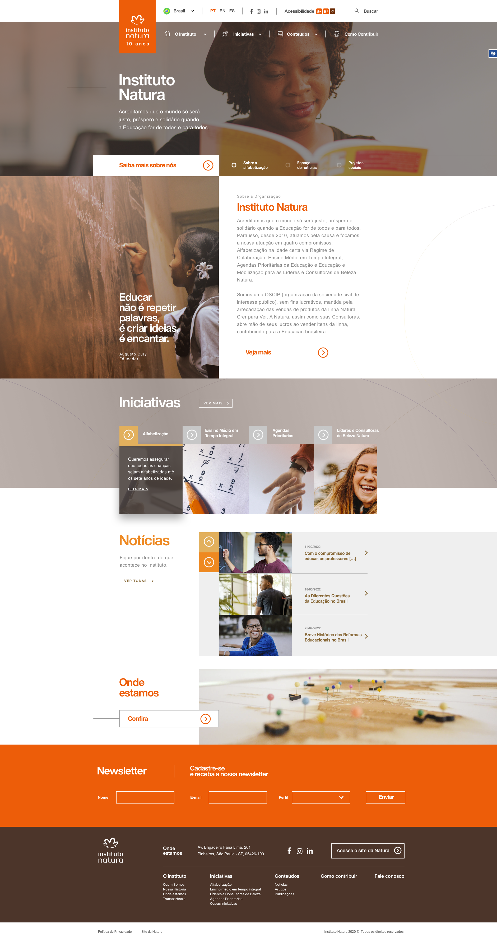 O site do instituto foi diagramado para ser um espaço focado em leitura de notícias e longos textos relacionados à projetos voltados para a educação. A diagramação foi realizada com espaçamentos em branco bem distribuídos que tornam a leitura agradável e com imagens bem relacionadas aos temas.