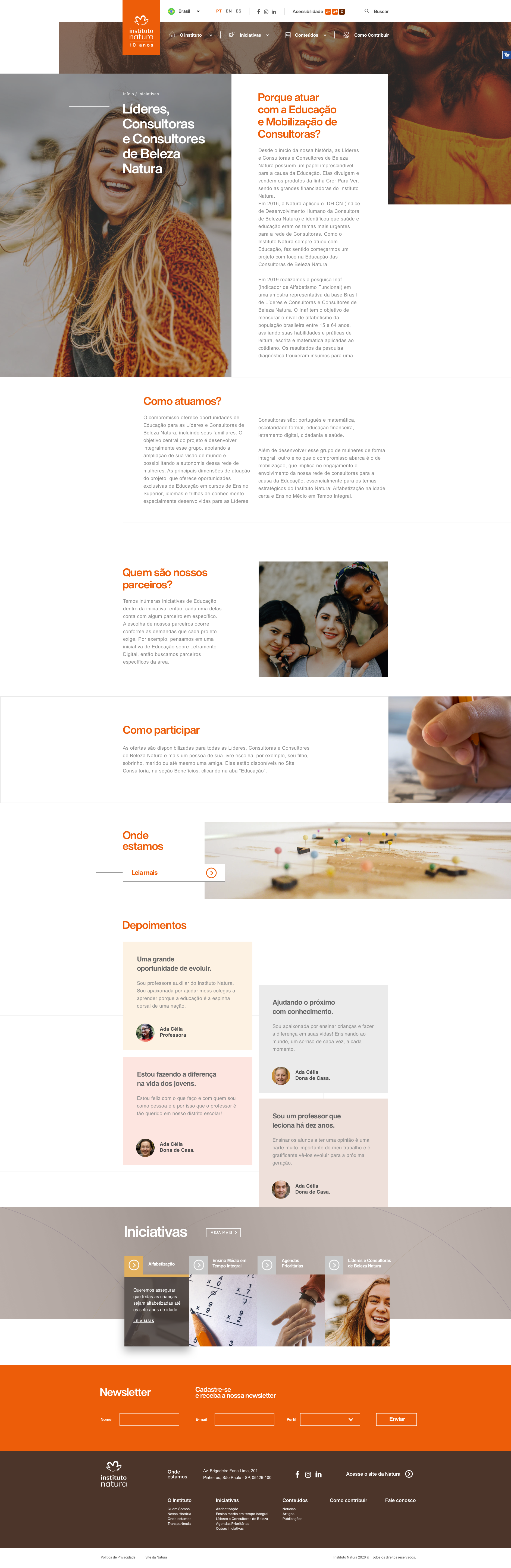 Contém informações sobre os segmentos atuantes do grupo Natura, dentre eles, alfabetização, ensino médio, agendas prioritárias, educação para colaboradores Natura e outras iniciativas.
